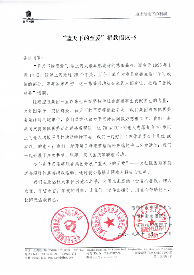 12月23日,鈺翔控股集團(tuán)黨總支、團(tuán)總支、工會(huì)聯(lián)合倡議,要求集團(tuán)黨團(tuán)員積極參與“藍(lán)天下的至愛”慈善捐款活動(dòng),經(jīng)過幾天的發(fā)動(dòng)和收集,共收到愛心捐款近4000元,12月27日,集團(tuán)黨總支秦祖煌書記愛心善款轉(zhuǎn)交到了東體居委黨總支范晟華書記的手里。此次活動(dòng)由鈺翔控股集團(tuán)黨總支與曲陽路東體居委會(huì)聯(lián)合主辦,目的是為社區(qū)困難家庭送去溫暖,讓困難人群安心過年。