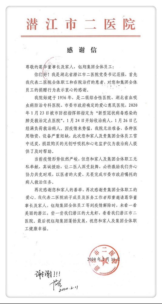 我院始建于1956年,是二級綜合性醫院,湖北省血吸蟲病防治??漆t院,市委、市政府確定的愛心惠民醫院。2020年1月23日被市防控指揮部指定為新型冠狀病毒感染的肺炎救治定點醫院,1月24日開始收治病人,1月26日已經滿負荷救治病人。因疫情來勢兇猛,我院無法準備,各種醫用物資、設備嚴重短缺,此次您和家人及貴集團全體員工雪中送炭捐款購買的無創呼吸機和心電監護儀,為救治病人提供了及時幫助。當前疫情形勢依然嚴峻,但您和家人、集團員工無私奉獻、真誠援助,讓二醫人深受鼓舞,必將激勵著我們齊心協力共克時艱,以醫者大愛、無畏,完成市委、市政府布置的病人救治任務。再次感謝您及家人的善舉,再次感謝貴集團全體職工的愛心。我代表二醫院班子成員及醫務工作者鄭重邀請葛華董事長與家人、鈺翔集團全體員工等到疫情結束時來看一看美麗的潛江,嘗一嘗我們潛江的小龍蝦,看一看我們潛江市二醫院。