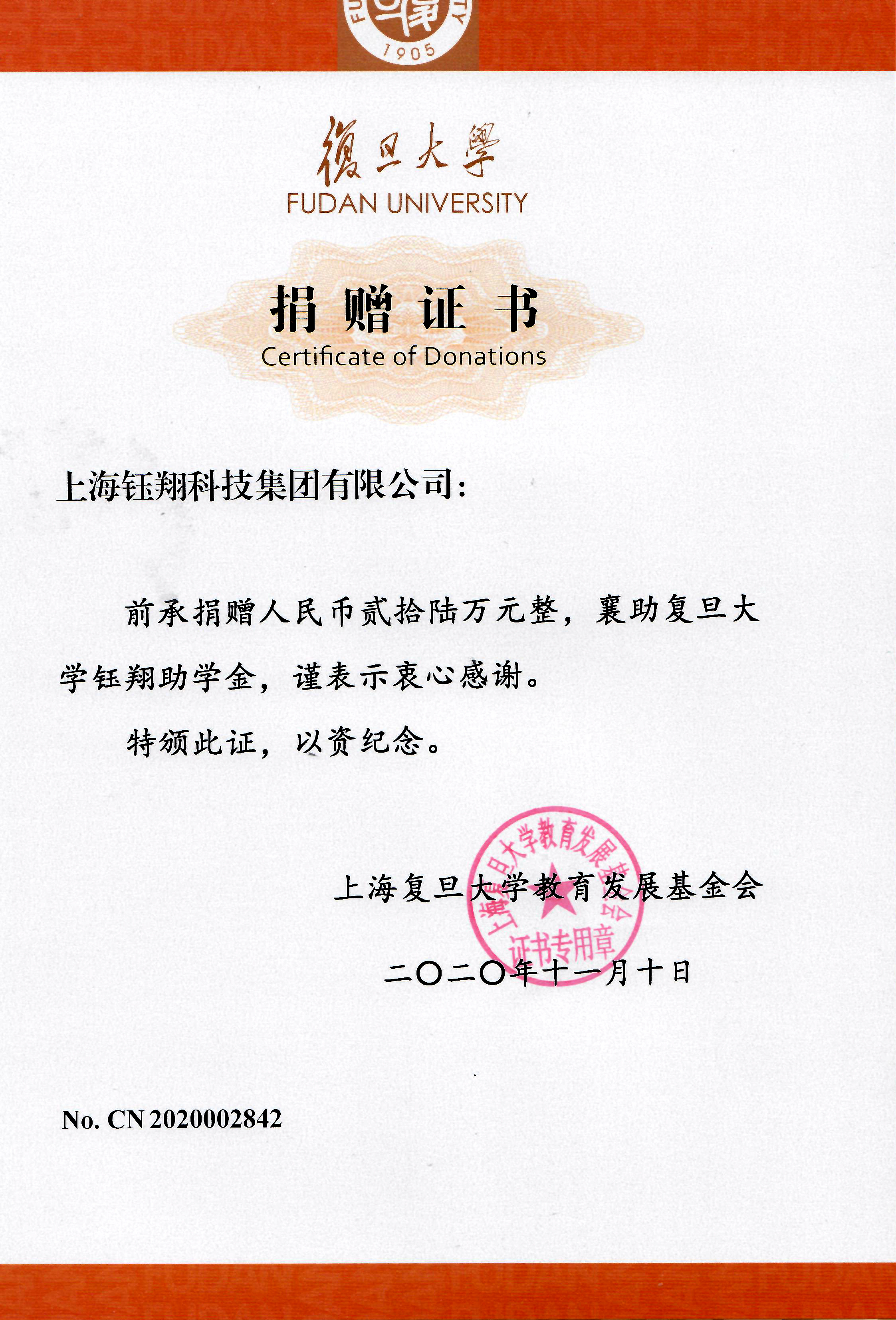 上海復旦大學教育發(fā)展基金會26萬元捐贈證書
